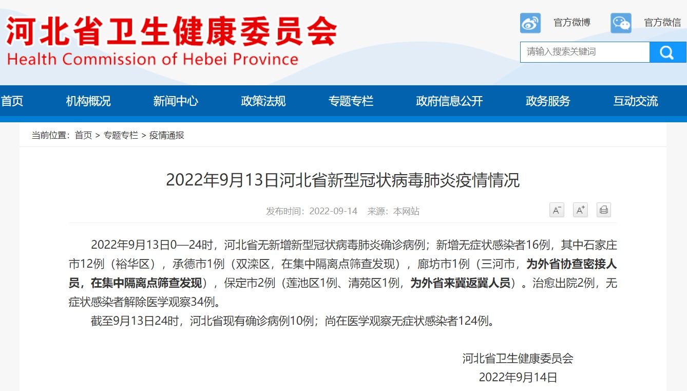 人民网石家庄9月14日电 据河北省卫健委发布的最新消息,2022年9月13日0—24时,河北省无新增新型冠状病毒肺炎确诊病例;新增无症状感染者16例,其中石家庄市12例(裕华区),承德市1例(双滦区,在集中隔离点筛查发现),廊坊市1例(三河市,为外省协查密接人员,在集中隔离点筛查发现),保定市2例(莲池区1例、清苑区1例,为外省来冀返冀人员)。治愈出院2例,无症状感染者解除医学观察34例。
